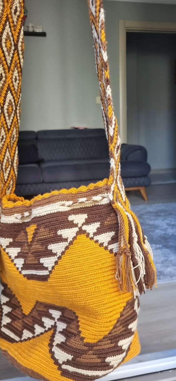 Kahverengi desenli örgü bohem kadın çantası, koyu ve canlı renkte, günlük kullanım için uygun.