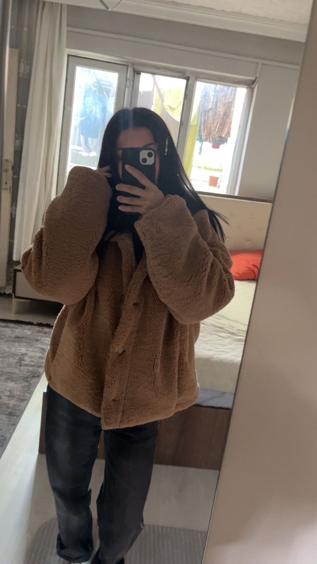 Kahverengi peluş kışlık kadın mont, rahat kesim ve kesik yaka ile dikkat çeker. Uzun kollu ve midi boy, günlük sokak stili için uygundur. en fazla 2 3 kere giyilmistir