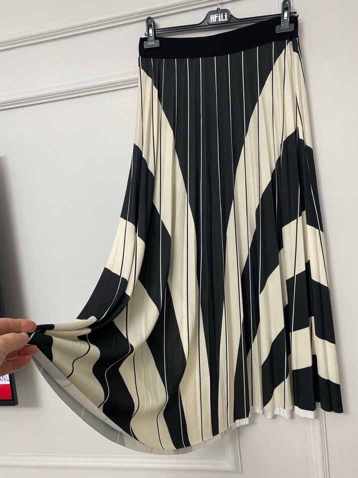 Kahverengi, desenli ve pilili uzun etek, sentetik kumaştan yapılmıştır. Salaş kesimi ve çağdaş tasarımı günlük kullanım için uygundur.
