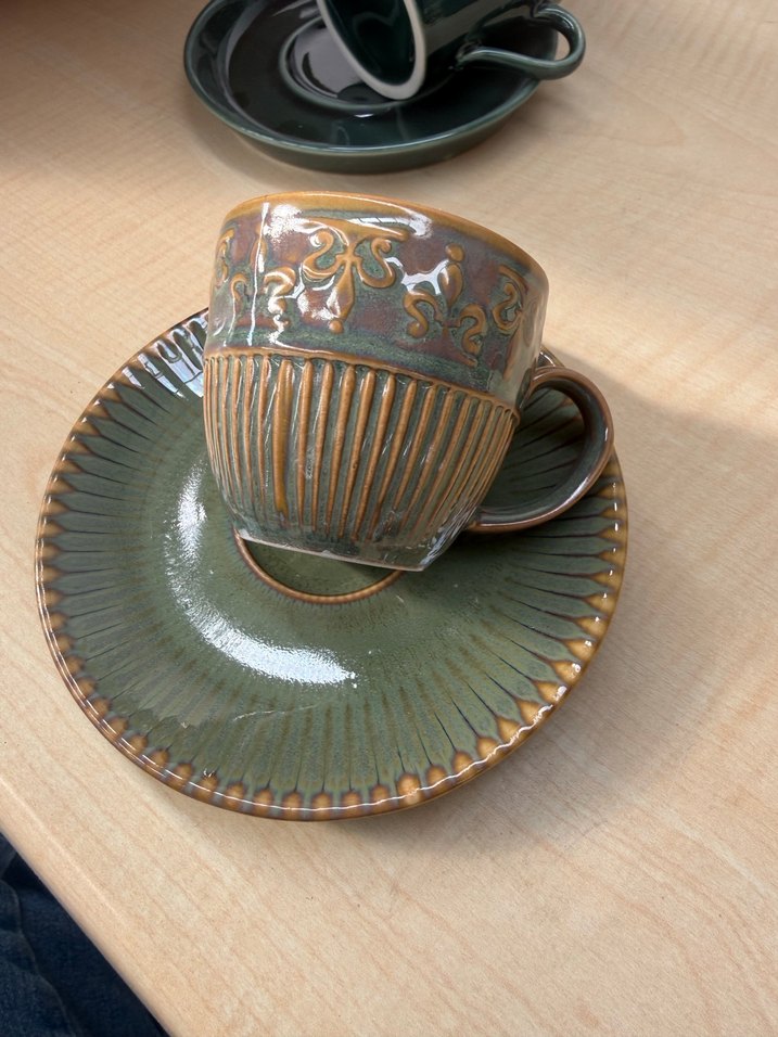 Kahverengi seramik fincan ve tabağın üzerinde detaylı desenler ve kabartmalı dokular bulunur, rustik ve şık bir görünüm sunar. ☕ kutulu ürün