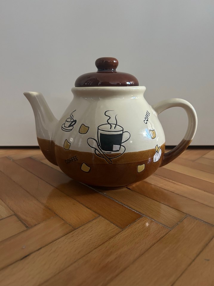 Kahverengi kapak ve tabana sahip seramik çaydanlık, kahve temalı desenlerle ve rahat sapıyla dikkat çekiyor. ☕