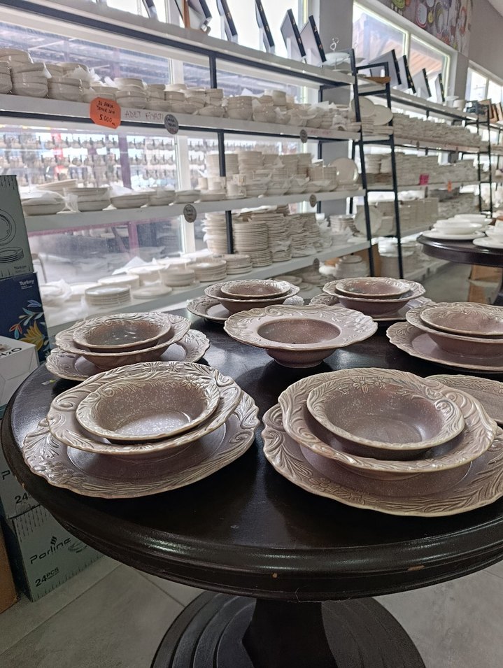 Kahverengi desenli seramik tabak ve kaselerden oluşan yemek takımı, yemek servisi için uygundur. ️