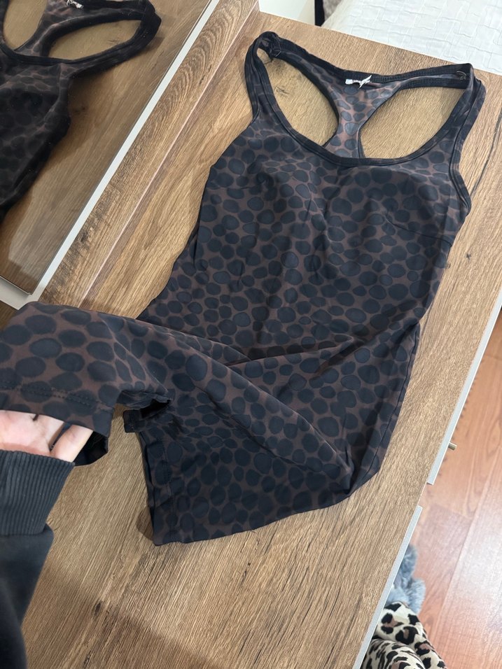 Kahverengi yılan desenli, uzun boylu, sırtı açık ve yüksek yakalı dar kesim mayo Şık ve rahat bir görünüm sunar.