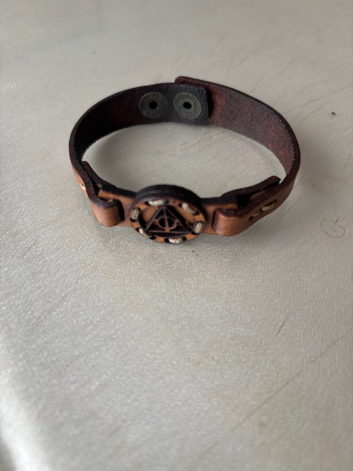 Kahverengi deri bileklik, gotik tarz amblem ve ayarlanabilir çıtçıtlar.