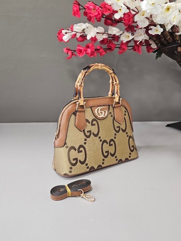 Kahverengi, parlak sentetik kumaştan, desenli ve tokalı detaylara sahip kadın çantası. Bambu görünümlü sap ve ekstra kayış ile sokak tarzına uygun.