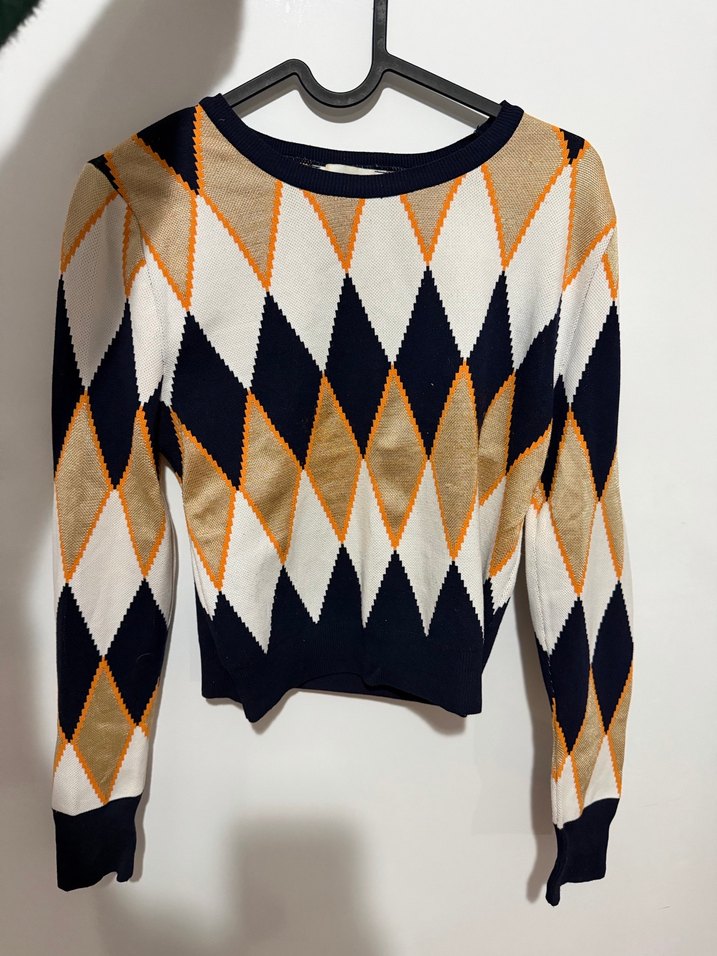 Bu fitted kadın kazak, uzun kollu ve yuvarlak yakalı olup, kahverengi, siyah, beyaz ve turuncu desenli örme kumaştan yapılmıştır. Günlük rahat kullanıma uygundur.