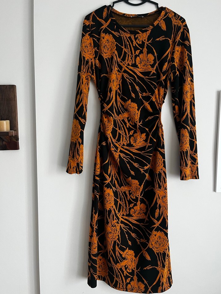 Kahverengi çiçek desenli, uzun kollu, drapeli ve fitted kesim bohem tarzda vintage elbise. Ofis için uygun, crew yaka ve ipeksi kumaşlı.