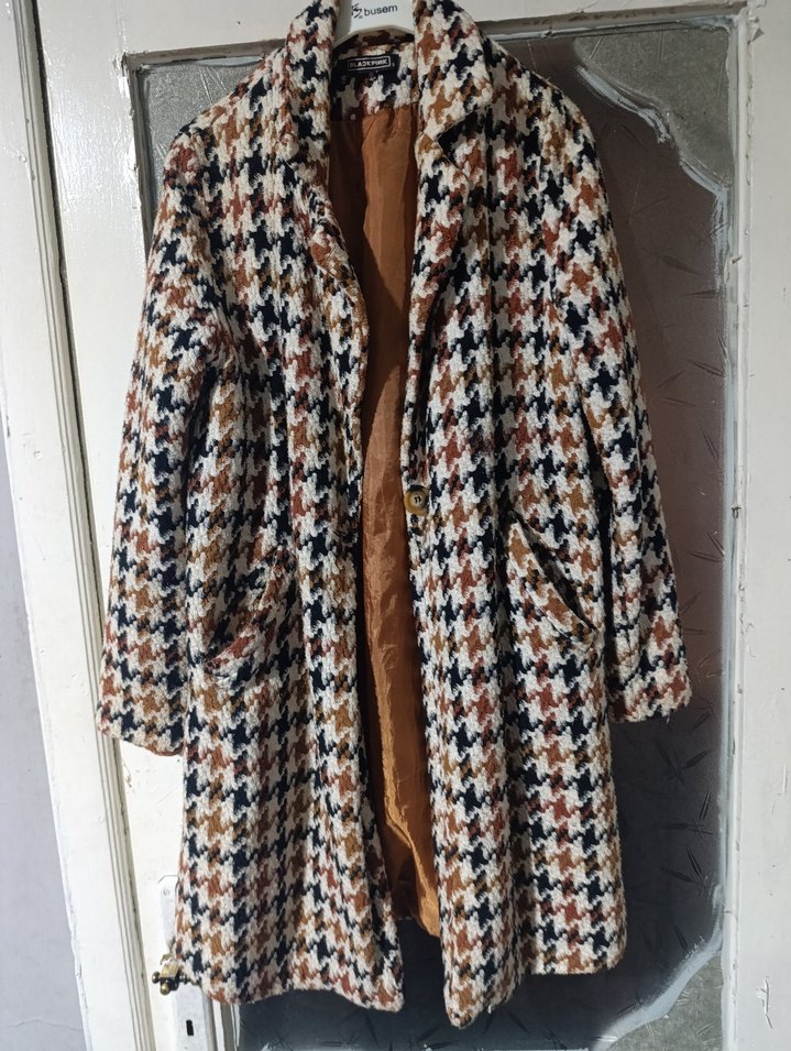Kahverengi tonlarda desenli, uzun ve bol kesim kadın kaban. Sentetik kumaş ve kürk detaylı, bohem sokak stili için uygun. Günlük kullanıma uygundur. üstünde çok küçük bı leke var .