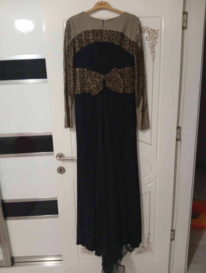 Drapeli, uzun kollu, kayık yaka ve desenli kahverengi kumaştan yapılmış, bol kesim uzun abiye elbisedir. Modern klasik ve vintage tarzda, düğünler için uygundur.