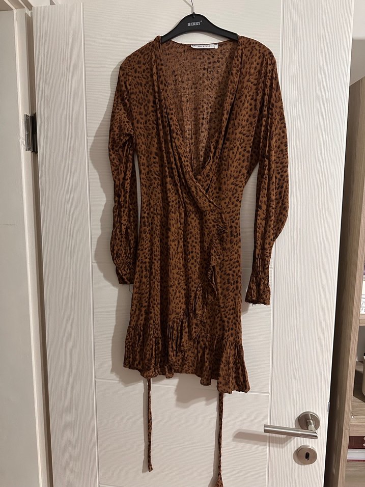 Kahverengi leopar desenli mini elbise, uzun kollu ve drapeli V yakaya sahiptir. İnce kuşağı bulunur. Kalıbı dardır