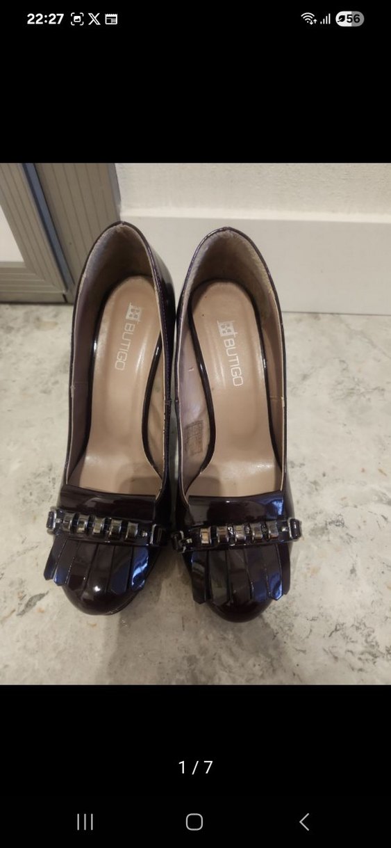 Kahverengi desenli yüksek topuklu stiletto. Kauçuk malzemeden, tokalı ve klasik gotik tarzda, ofis için uygun.
