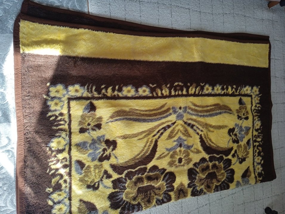 Kahverengi taban üzerine sarı ve kahverengi tonlarda detaylı çiçek desenli yumuşak ve sıcak tutan battaniye.