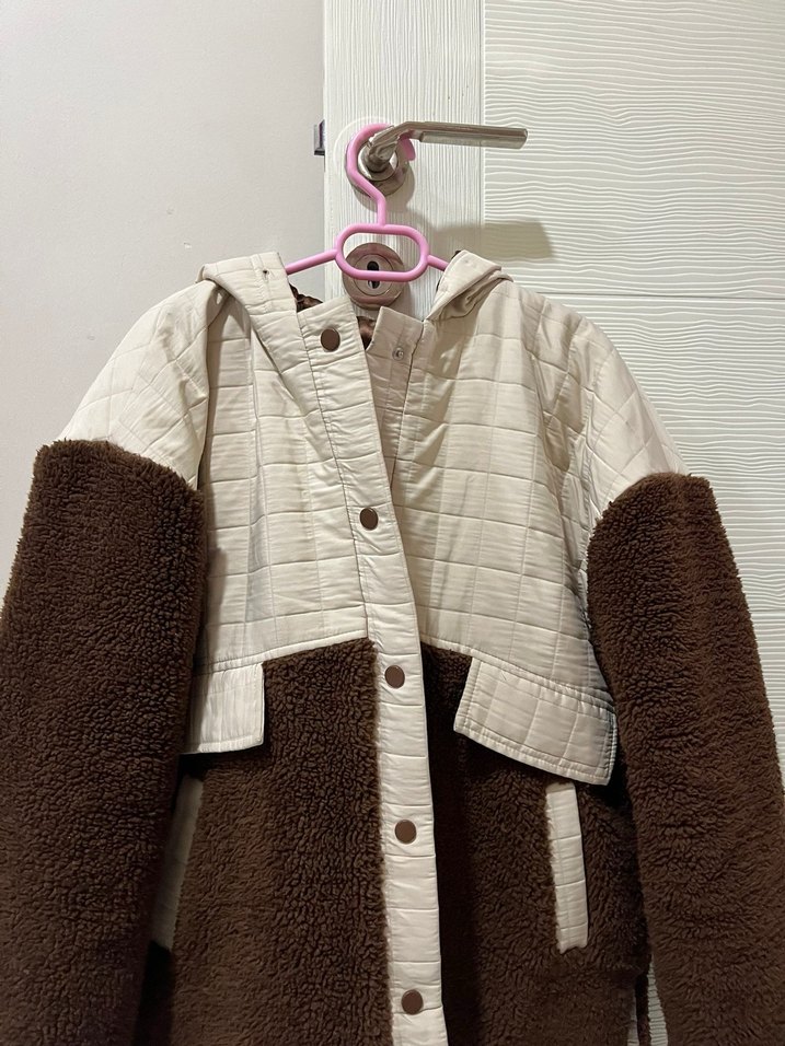 Kadın mont, bol kesim, uzun kollu ve yakası kesikli. Yumuşak, sıcak kumaş ve kahverengi-gri kürk detaylı, midi boy, rahat sokak stili.