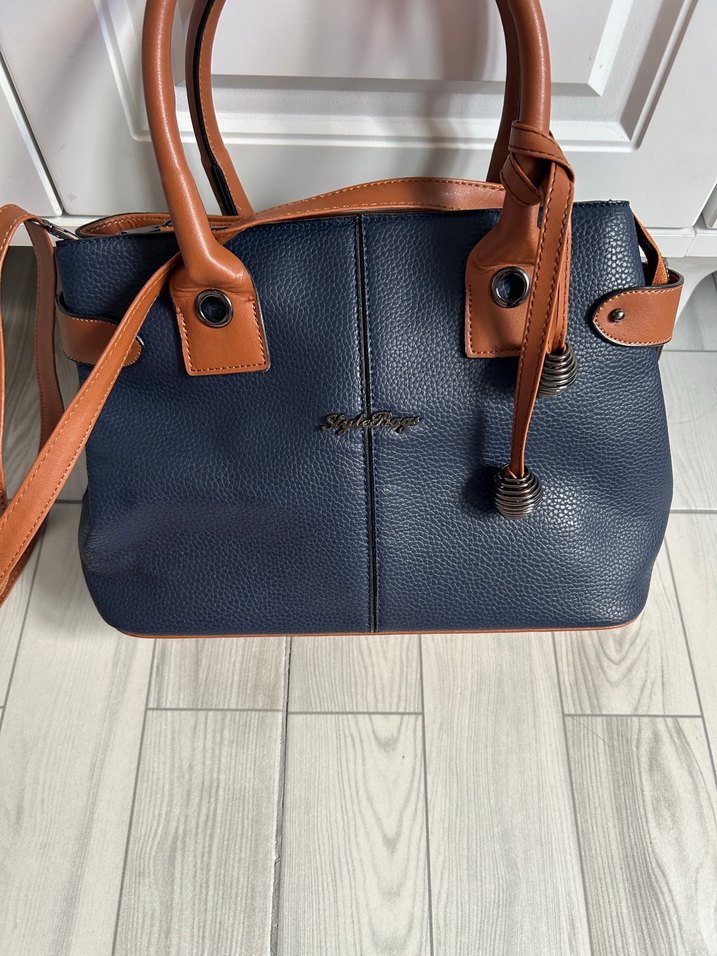 Kahverengi tokalı detaylara sahip lacivert deri kadın çantası, modern klasik tarzda, günlük kullanıma uygun, deseniz ve sağlam saplıdır. Kusuru yoktur yenidir.