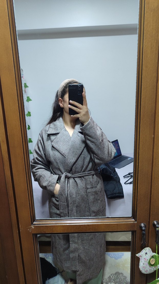 kahverengi detaylı midi kadın kaban, bol kesim ve geniş yakaya sahiptir. Yumuşak ve sıcak kumaştan üretilmiş, uzun kollu ve kemerli rahat bir şıklık sunar. Günlük kullanıma uygundur. astarsızdır.