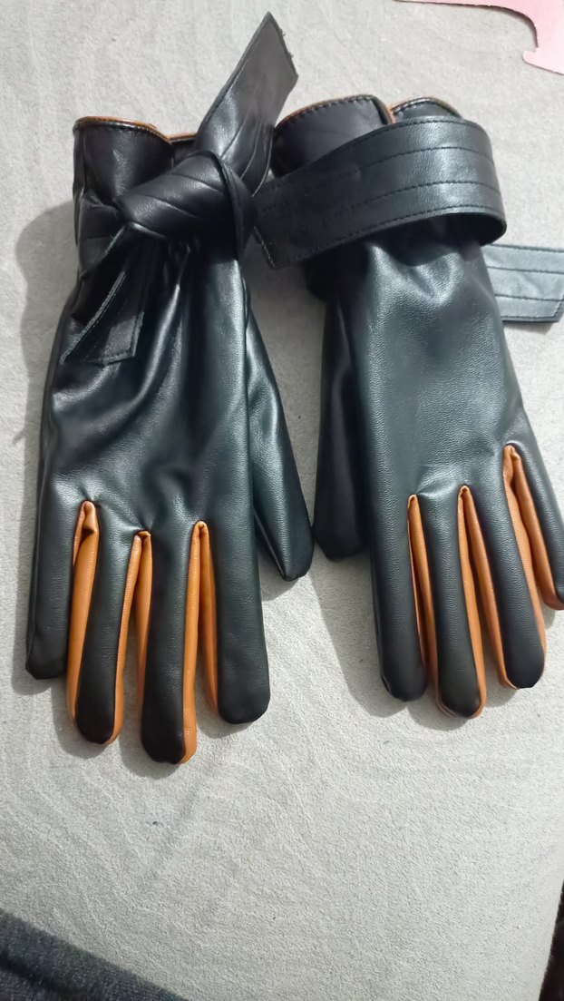 Kahverengi parmak detaylı siyah deri eldiven modaya uygun tasarım sunar.