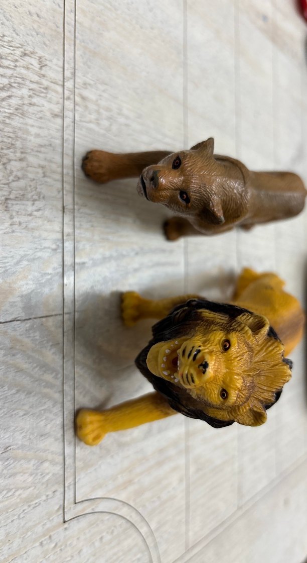 Koyu kahverengi/sarı tonlarında detaylı aslan ve aslan yavrusu figürleri.