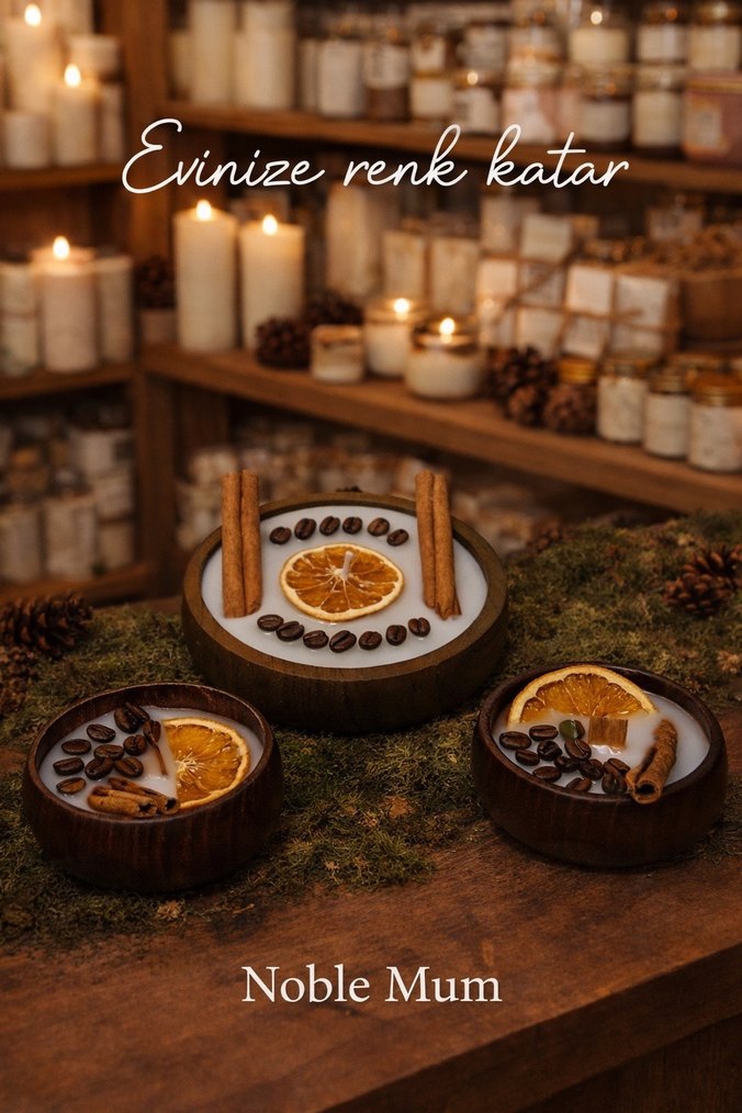 Kahverengi doğal mumlar, kurutulmuş portakal dilimleri, tarçın çubukları ve kahve çekirdekleri ile süslenmiştir. Evinize sıcaklık katar. ️