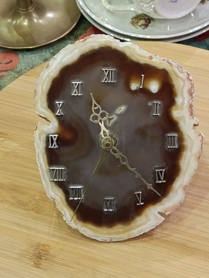 Kahverengi doğal taş yüzeye sahip masa saati, Roma rakamları XI, XII ve IX ile süslenmiştir. Zarif kolları ve benzersiz şekli vardır. ⏰