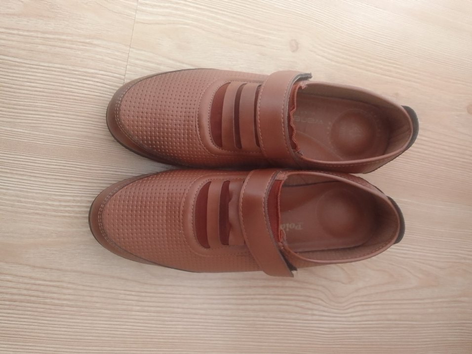 Parlak kahverengi, dolgu topuklu kadın günlük ayakkabısı. Tokalı bantlı, minimalist ve desensiz tasarıma sahip, rahat kauçuk malzeme kullanılmış.