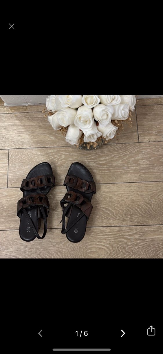 Kahverengi dolgu topuklu, çiçek desenli tokalı kadın sandalet. Bohem tarz ve düğün için uygun.