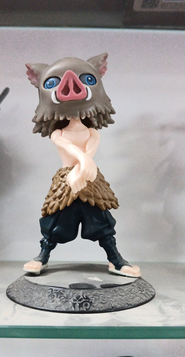 Kahverengi ve siyah renklerde, mavi gözlü domuz maskesi takan karakter figürü. Detaylı taban üzerinde duruyor.