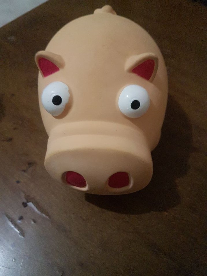 Büyük gözlü, küçük kulaklı açık kahverengi domuz şeklinde yumuşak oyuncak. sıkınca ses cikariyor yumsak bir dokusu var