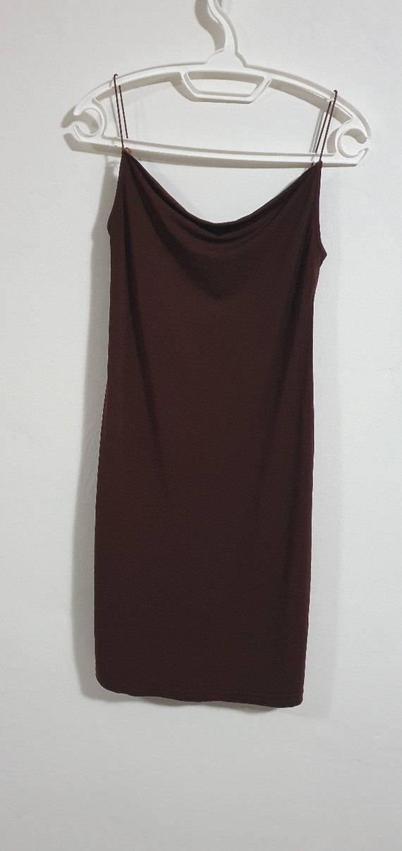 Kahverengi renkli, drapeli ve straplez yaka detaylı, midi boyda, ince kesim, ipeksi dokulu kadın elbisesi. Minimalist ve sade tarz için uygundur.