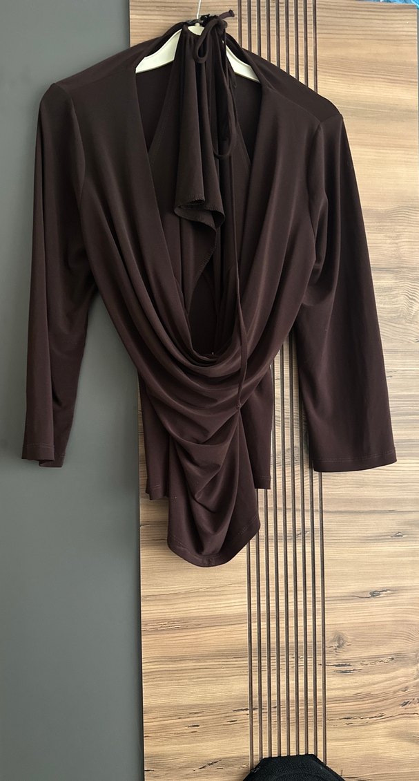 Uzun kollu, drapeli ve degaje yaka kahverengi kadın bluz. Sentetik kumaştan, ofis için uygun, vücuda oturan kesim. Boyundan bağlamalı.