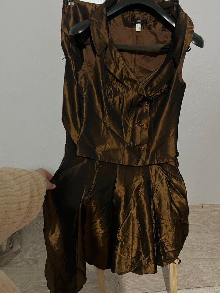 Kahverengi, drapeli, kolsuz ve yakası notched lapel olan bu takım Eteğin boyu 104cm bel genişliği 68cm gömlek kolsuz boyu 53 cm bel genişliği 80cm