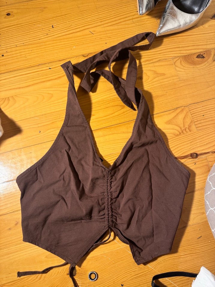 Kahverengi, yumuşak keten kumaştan yapılmış, halter yaka ve drapeli tasarıma sahip, vücuda oturan minimalist bohem crop top.