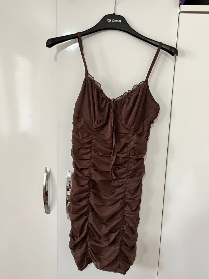 Drapeli tasarıma sahip, ince askılı ve straplez yakalı kahverengi midi elbise. Sade ve iddialı görünümüyle romantik akşamlar için uygundur.