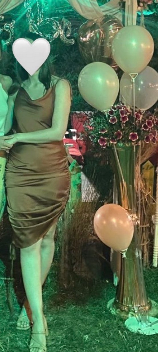 İpek görünümlü, drapeli ve ince askılı uzun elbise. Kahverengi renkte, degaje yakalı ve vücuda oturan kesimle romantik akşamlar için ideal. Yan ipleriyle büzgü derecesini elbisenin uzunluğu kısalığını ayarlayabilirsiniz.