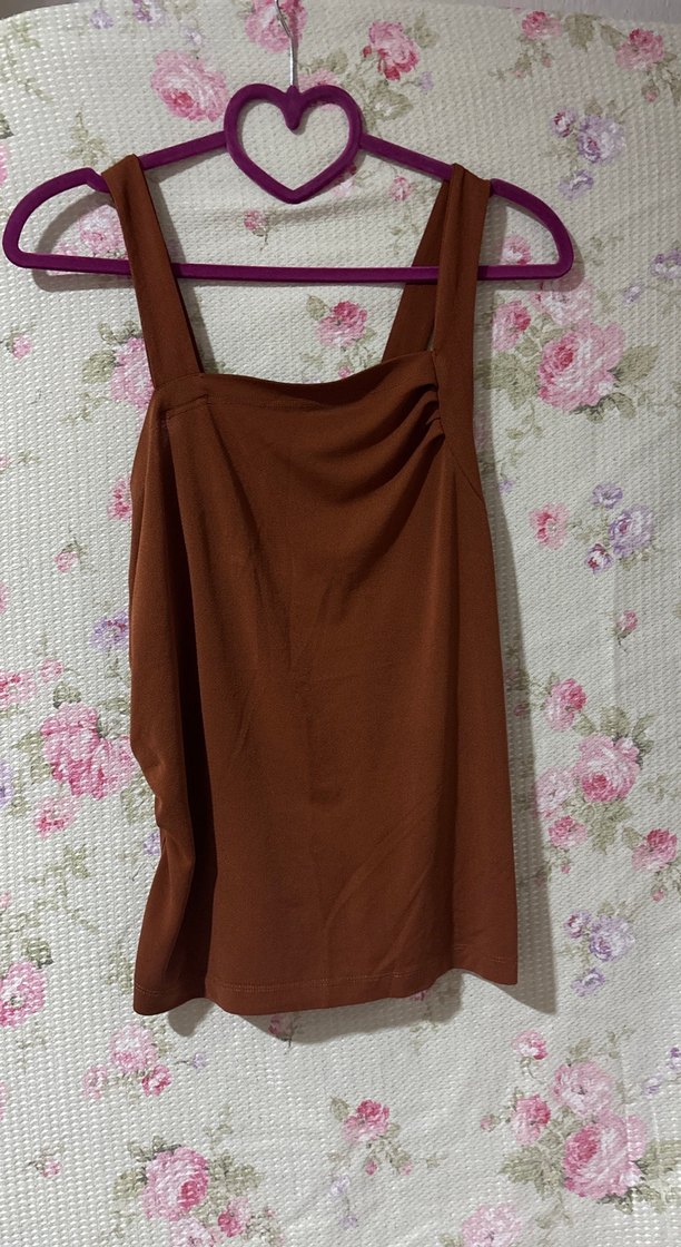 Kahverengi, drapeli ve vücuda oturan kadın midi atlet. Sentetik kumaştan, minimalist ve sokak stiline uygun, günlük kullanım için ideal.