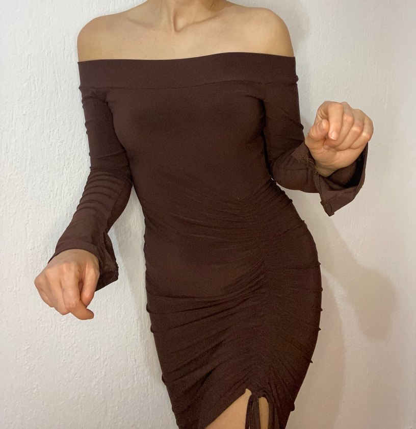 Kahverengi, uzun kollu, kayık yaka ve drapeli detaylı, vücuda oturan midi kalem elbise, yumuşak sentetik kumaştan üretilmiştir.