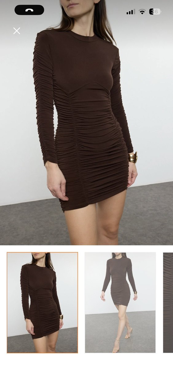 Kahverengi süet kumaştan, drapeli ve V yaka, ince askılı, fit kesim mini elbise. Parti için modern bir tercih. Dar kalıp