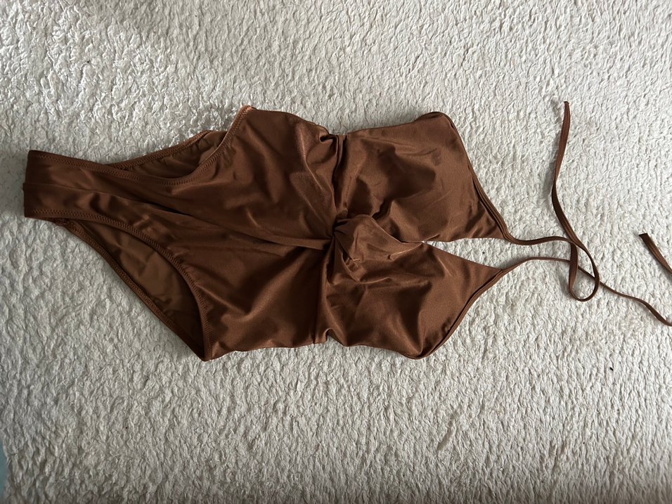 Kahverengi, drapeli tasarıma sahip, askılı ve vücuda oturan kadın monokini. Desensiz, midi boyda, günlük kullanıma uygun.