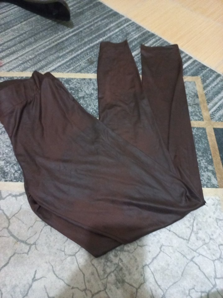 Yumuşak sentetik kumaştan yapılmış, kahverengi drapeli ve dar kesim uzun tayt, günlük rahat kullanım için uygundur. kendinden desenli tayt tertemiz esnek sorunsuz ölçü sormayın m beden 65 kg a kadar herkese olur likrali
