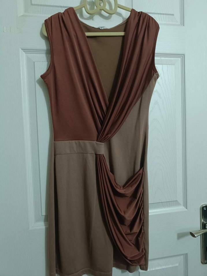 V yaka, kolsuz, drapeli detaylı, karamel kahve renklerde midi boy, sıkı kesim elbise. Ofis için uygun, sentetik kumaştan yapılmıştır.