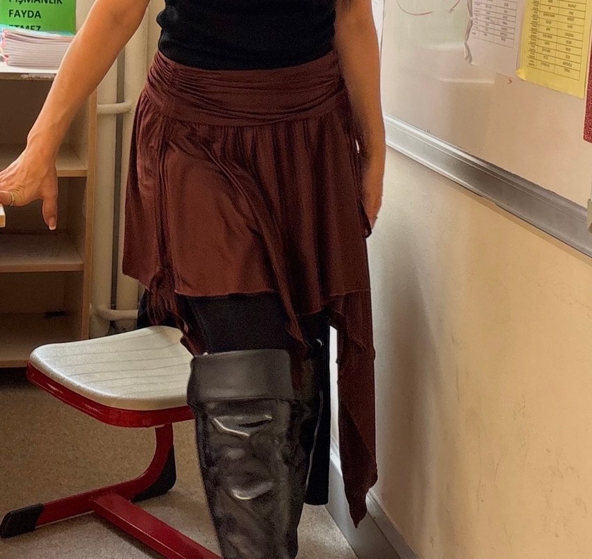 Koyu kahverengi eteği, drapeli detaylarla gotik ve avangart tarz sunar, günlük kullanım için uygundur.