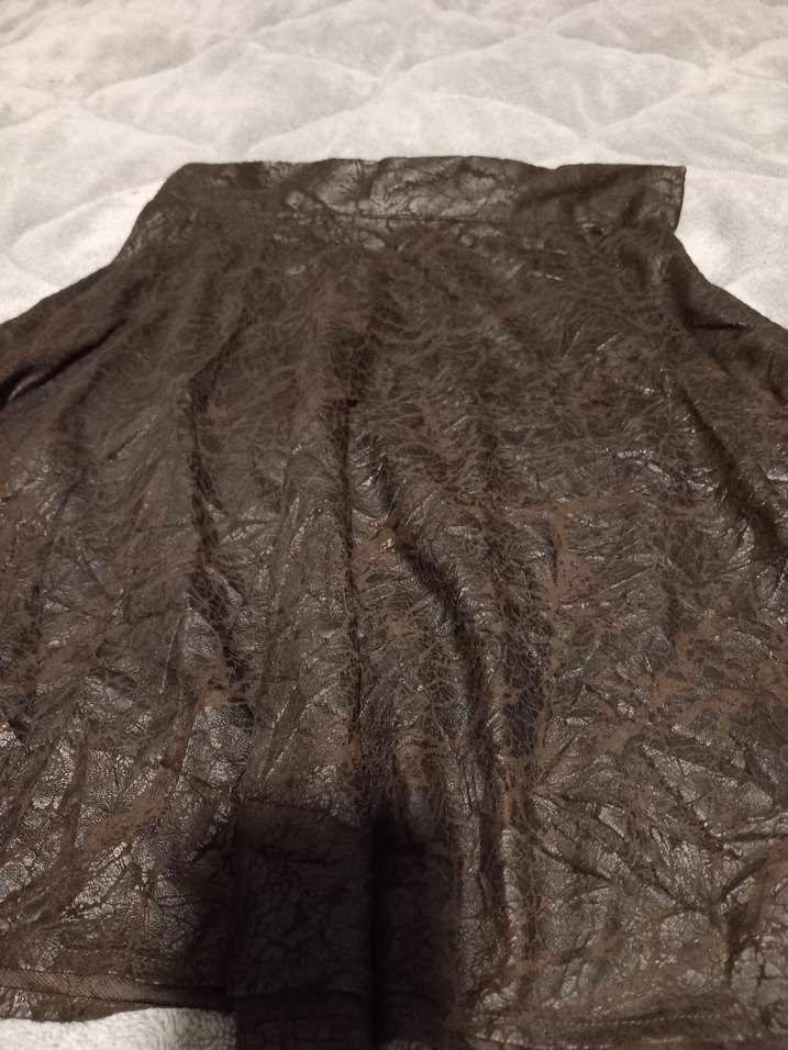 Koyu kahverengi sentetik kumaştan, drapeli ve fit kesimli midi hamile eteği. Düz ve desen içermeyen, günlük kullanıma uygun goth tarzında.