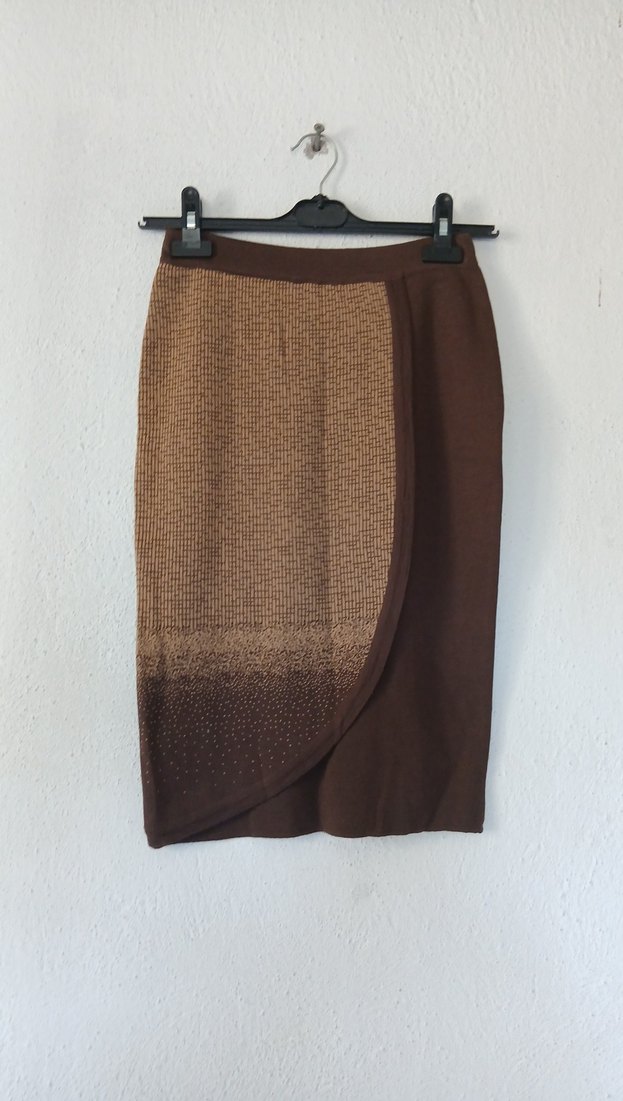 Yumuşak triko kumaştan, kahverengi, drapeli ve fitted kesim midi etek. Minimalist ve çağdaş tarzıyla ofis için uygundur.