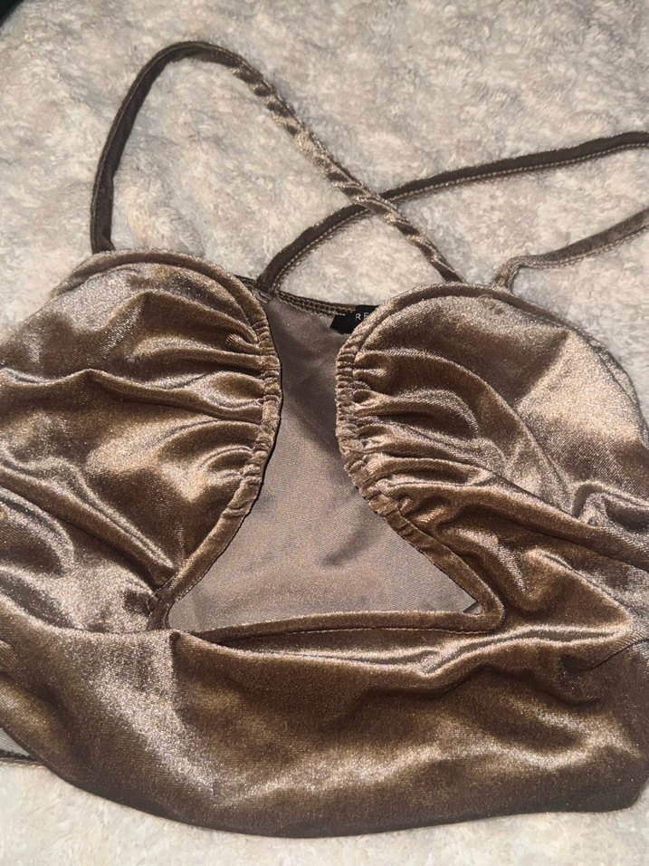 Kahverengi süet, V yakalı ve ince askılı bu dar kesim büstiyer, parlak drapeli detaylara sahiptir. Mini boyu ve gösterişli tarzıyla partiler için uygundur.