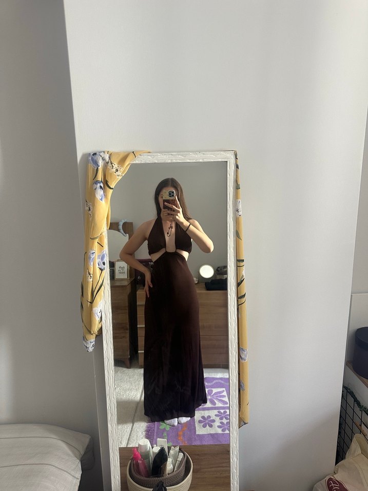 Drapeli, straplez yakalı ve ipeksi kumaşlı kahverengi tie-dye desenli, bohem tarzda, fitted midi elbisedir. Romantik akşamlar için uygundur.