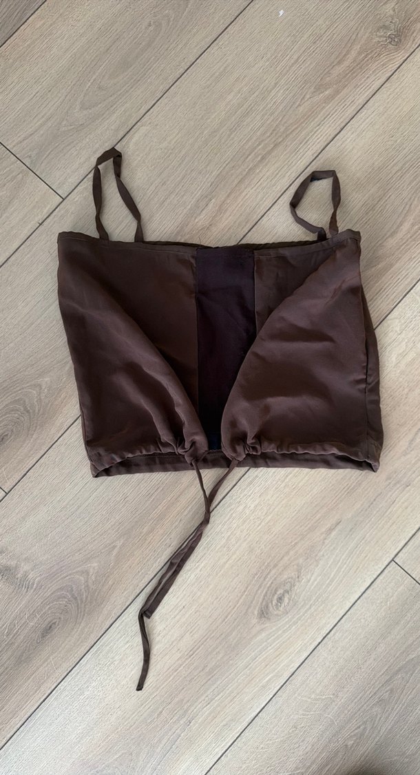 Kahverengi, ince askılı ve drapeli detaylı, vücuda oturan sentetik kumaştan yapılmış bir büstiyerdir. Günlük kullanıma uygun sokak stili sunar.