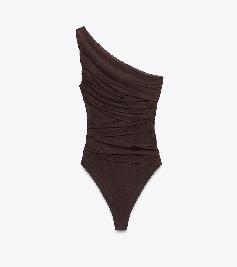 kahverengi, drapeli ve tek omuz askılı, straplez yakalı, vücuda oturan modern ve minimalist tarzda body