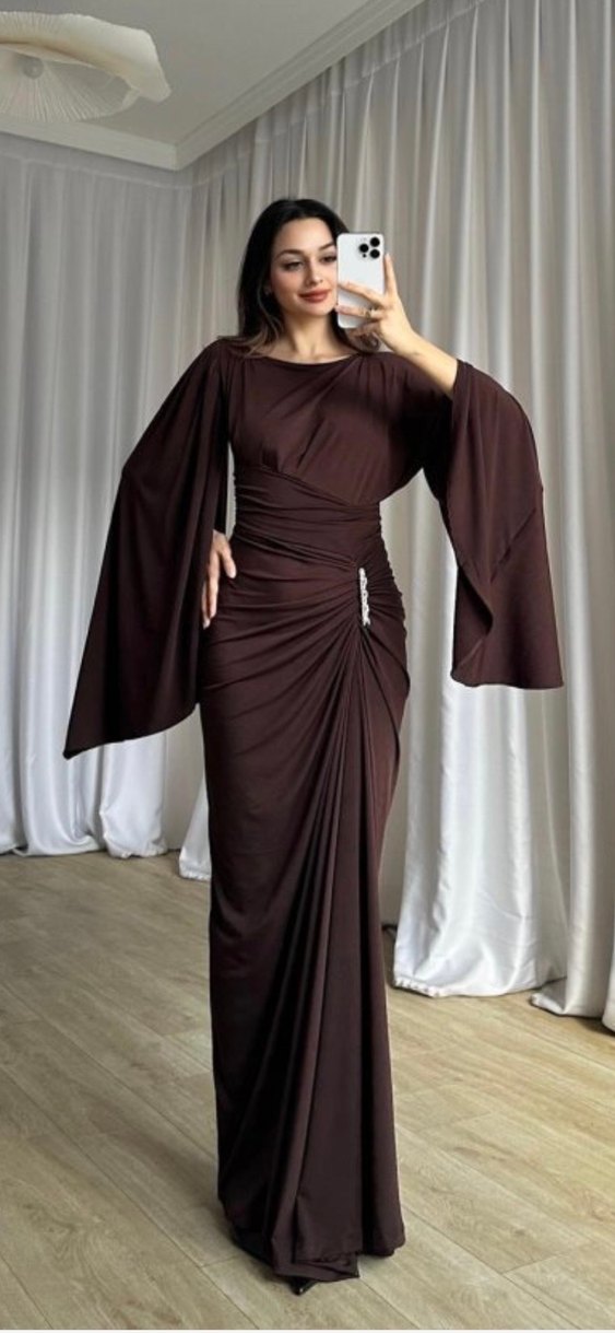 Kahverengi Drapeli Uzun Abiye Elbise