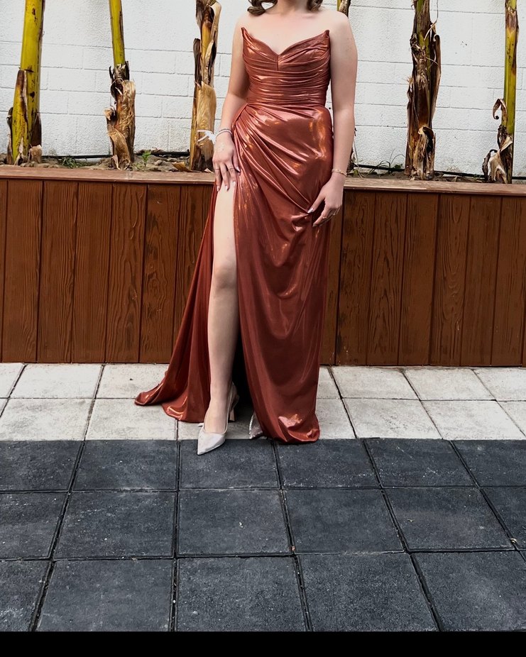 Kahverengi, parlak kumaştan, drapeli ve askılı, straplez uzun abiye elbise. Düğün ve özel davetler için uygundur. teklif kabul ediyorum