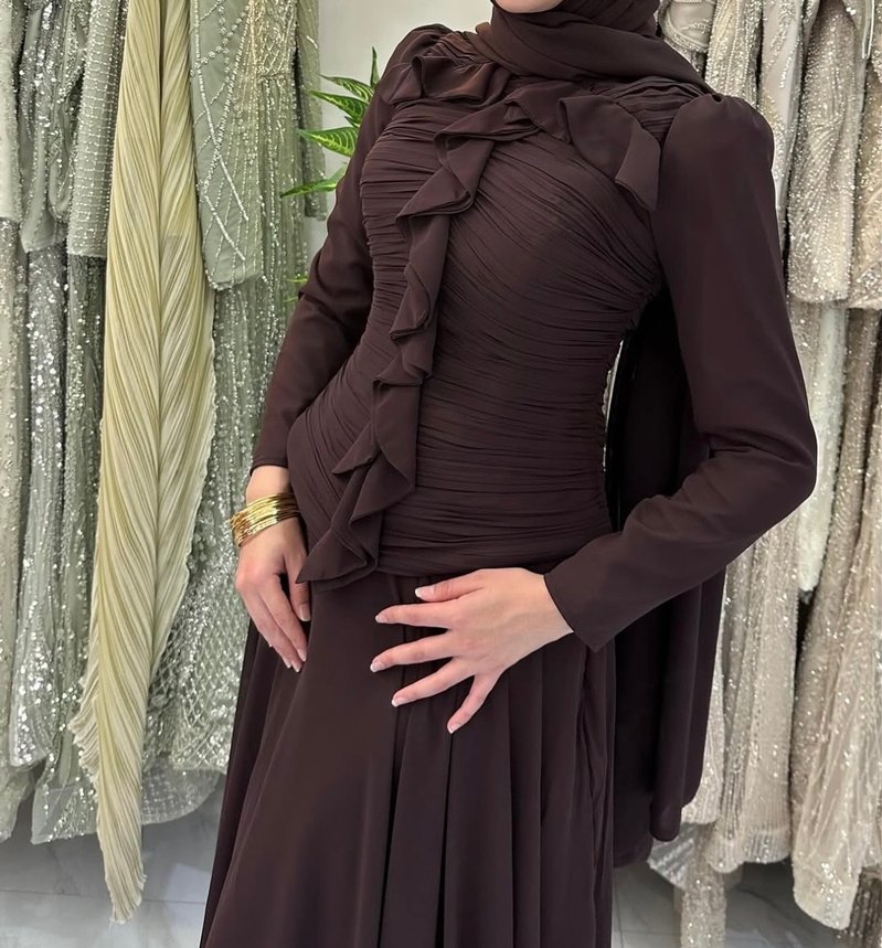 Kahverengi, uzun kollu, yüksek yakalı ve drapeli detaylara sahip, şık ve fit kesim abiye elbise. Düğün için uygun, mütevazı ve gösterişli tarzda.