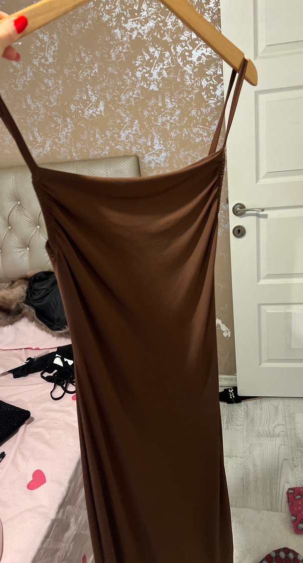 Kahverengi Drapeli Uzun Askılı Elbise